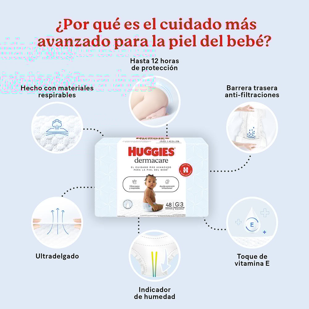 Los Pañales Huggies Dermacare Talle M 58 Unidades ofrecen hasta 12 horas de protección con materiales ultrasuaves y respirables que cuidan la piel del bebé. Su diseño ultradelgado permite mayor comodidad y movilidad, mientras que la barrera trasera anti-filtraciones y el toque de vitamina E ayudan a prevenir irritaciones. Ideal para bebés de 5.5 a 9.5 kg.